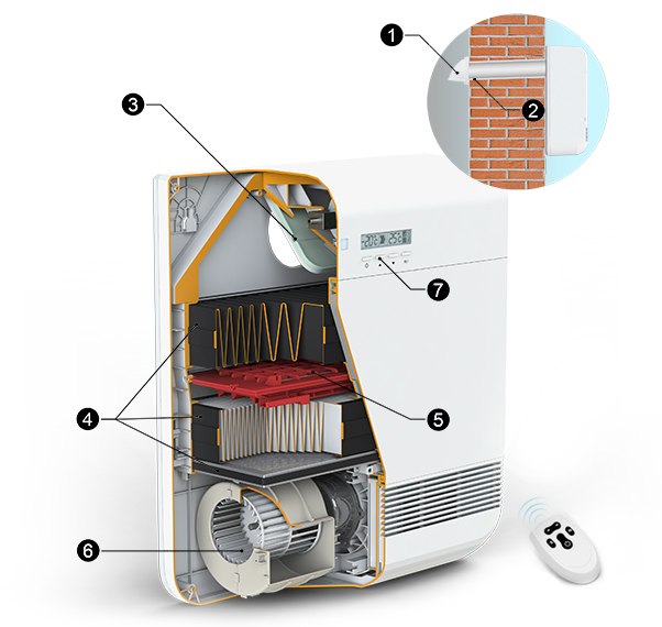 5. Нагреватель. Зимой подогревает приточный воздух до температуры, установленной пользователем. Система климат-контроля автоматически регулирует мощность подачи воздуха в помещение при изменении температуры на улице.
